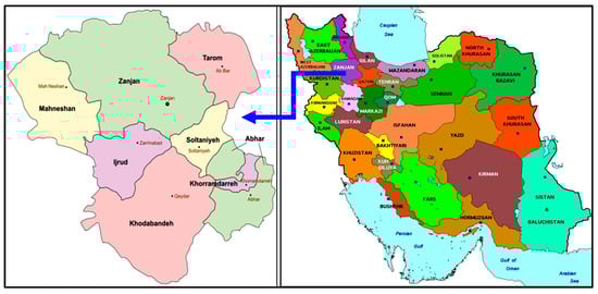 Iran is located in Northwest Asia, with an area of 1,648,195 km2 and a population of about 85 million people. The capital of this country is Tehran. Zanjan province is in northwest Iran, with an area of 22,164 km2 and a population of 1.1 million. The geographical location of Zanjan province in Iran is shown in Figure 1 [].