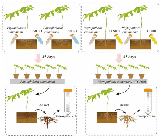The seedlings were cultivated in a greenhouse with regulated environmental parameters, including a temperature of 24 °C, a 16 h light cycle, and 80% relative humidity. They were irrigated using sterile double-distilled water (ddH2O). The watering strategy was to maintain the surface soil of the pots in a moist condition. Rhizosphere soil samples were collected 45 days after inoculation with Phytophthora cinnamomi. Following the meticulous removal of surface soil, the plants were delicately uprooted. Any soil clinging to the roots was subsequently cleared using a sterilized brush. The rhizosphere soil samples were placed into 50 mL polypropylene tubes, rapidly frozen using liquid nitrogen, and then preserved at −80 °C. Each experimental condition included three biological replicates, with five plants pooled for each replicate (Figure 1).