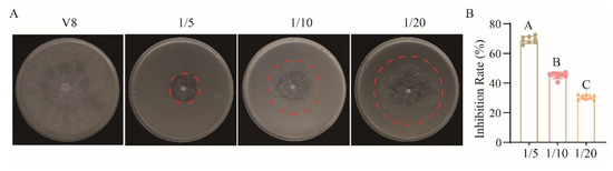 The antifungal activity of different concentrations of the TCS001 fermentation filtrate against P. cinnamomi ST402 was evaluated on a V8 medium (Figure 3A). As shown in Figure 3, different concentrations of fermentation filtrate have varying inhibitory effects on the pathogen P. cinnamomi ST402, with values of 68%, 49%, and 36%, respectively (Figure 3B). Additionally, the optimal treatment condition for the TCS001 fermentation filtrate was determined to be a liquid-to-water dilution ratio of 1:5. The results indicated that TCS001 fermentation filtrate can inhibit the development growth of Phytophthora cinnamomi.