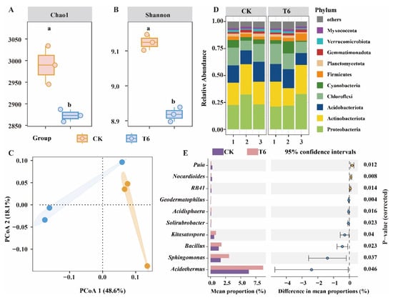 We further assessed the relative abundance of bacteria at both the phylum and genus levels. The composition of the bacterial community was examined at these taxonomic levels. Proteobacteria, Actinobacteriota, and Acidobacteriota were the dominant phyla in both control (CK) and treatment (T6) groups (Figure 5D; Table S2), with similar relative abundances, as follows: Proteobacteria (CK: 26.04%; T6: 25.36%), Actinobacteriota (CK: 23.28%; T6: 22.12%), and Acidobacteriota (CK: 15.81%; T6: 14.98%). At the genus level, the Welch’s t test revealed significant differences (p < 0.05) in the relative abundance of ten genera between CK and T6 (Figure 5E). Seven genera showed significantly increased abundance in T6 compared to CK (Figure 5E), including Acidothermus, Sphingomonas, and Bacillus (increases of 2.40%, 1.39%, and 0.45%, respectively; Table S2).