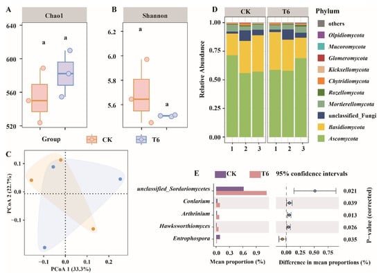 Fungal diversity and microbiome composition were analyzed across different rhizosphere soil samples. Fungal alpha diversity, evaluated using the Chao (A) and Shannon (B) indices, showed significant variation across treatments, with distinct lowercase letters marking significant differences (p < 0.05, Tukey test). Principal coordinate analysis (PCoA) based on the Bray–Curtis distance matrix (C) demonstrated distinct clustering patterns. The relative abundances of fungal phyla in rhizosphere soil samples from different treatments are displayed in (D). The Kruskal–Wallis H test (E) revealed significant differences in fungal phyla. (Lowercase letters indicate significant differences).