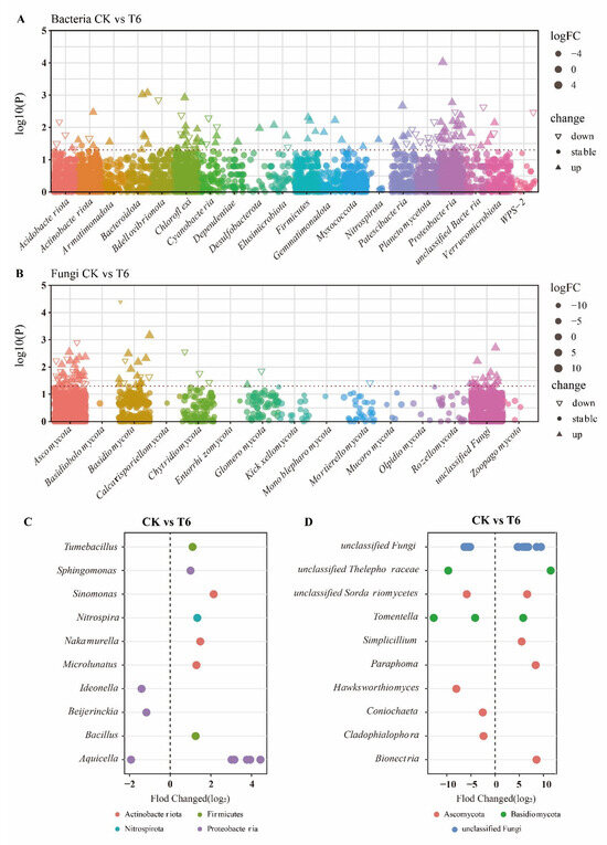 Enrichment (up) and depletion (down) of bacterial (A) and fungal (B) OTUs between CK and T6 groups. Comparative analysis of the top 10 bacterial (C) and fungal (D) genera showing significant enrichment or depletion in OTUs between CK and T6 treatment groups. Colors of points indicate phylum classification.