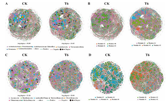 Co-occurrence networks for bacterial and fungal communities in control (CK) and treatment (T6) groups were constructed to investigate changes in microbial community interactions. Networks were generated using R (v4.3.1) based on Spearman correlation coefficients; only significant (p < 0.05) correlations with |R| > 0.6 were included [22]. Network visualization employed a Fruchterman–Reingold layout in Gephi.