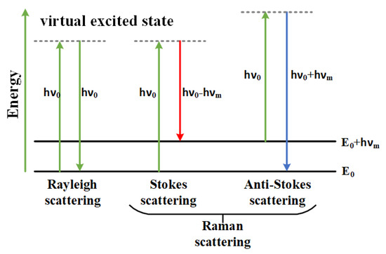 In spectroscopy detection, the photons emitted by the laser interact with the electron clouds and molecular bonds in the sample, leading to Rayleigh scattering and Raman scattering. The excited molecules transition from the ground state to a higher-energy excited state and then return to other vibrational levels. This process is divided into Stokes Raman scattering, in which the photon energy decreases from h0 to h0 − hm, and anti-Stokes Raman scattering, in which the photon energy increases from h0 to h0 + hm. The electron energy level transitions for Raman and Rayleigh scattering are shown in Figure 1 [11,12,13]. According to the Boltzmann distribution, molecules in the ground state are more stable in thermal equilibrium; thus, most molecules are in this state. Because Stokes Raman scattering involves transitions from the ground state, its probability is higher than that of anti-Stokes Raman scattering.