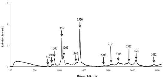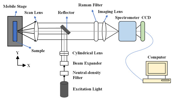 During Raman scattering, changes in photon energy produce Raman shifts that arise from alterations in molecular vibrations or spin states. Correspondingly, the stretching vibrations and spin states of molecular chemical bonds can be analyzed using Raman spectroscopy. Initially, Raman spectroscopy was applied to detect hydrogen bonds but has since been advanced to identify covalent bonds, such as C−C, −C=C−, N−O, and C−H bonds [15]. For instance, carotenoids in citrus fruits exhibit three prominent Raman characteristic peaks at Raman shifts of 1003 cm−1, 1155 cm−1, and 1520 cm−1, corresponding to −C=C− bond stretching vibration, C−C bond stretching vibration, and in-plane CH3 vibrations, respectively, as shown in Figure 2 [16]. Changes in the content of organic compounds can be assessed by analyzing the position and intensity vibrations at these peaks. During the acquisition of Raman spectra, interference from ambient light and temperature variations significantly affects the results. Ambient light introduces additional signals to the detector, which are superimposed on the true Raman spectrum, leading to increased background noise and a reduced signal-to-noise ratio. Therefore, background light sources should be shielded during measurements and eliminate the interference of background light in the spectrum. The optical components of spectrometers should be operated at their designed working temperature. Temperature variations affect the refractive index of optical elements, the optical path, and focusing performance. Thus, it is essential to acquire spectra under constant temperature conditions [17,18]. The Raman signal generation process involves photons emitted by the laser being refracted onto the sample through a dichroic mirror. The scattered light is then filtered and transmitted to the spectrometer through a dichroic mirror and a filter. Finally, the beam is focused on the detector, where the collected signal is converted into an electrical signal [19]. The configuration of the Raman spectrometer is illustrated in Figure 3.
