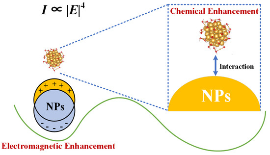 To enhance the intensity of the Raman signal, target molecules are adsorbed onto the substrate surface of metal nanoparticles (NPs) due to the surface plasmon resonance effect of metal NPs and the charge transfer between molecules and metals, as shown in Figure 4, in which both physical and chemical enhancement mechanisms amplify the Raman scattering intensity by up to 1014-fold. However, the intensity is amplified only 104- to 106-fold in the absence of NPs [22,23]. Table 1 presents the optimal types and morphologies of metal substrates for detecting fruit compounds utilizing the SERS technique. Metal substrates play a crucial role in SERS, so the preparation of metal substrates is essential for achieving Raman signal enhancement. Usually, substrates can be prepared using methods such as electrochemical deposition, vacuum evaporation, and metal colloids [24,25,26]. When prepared using electrochemical deposition, such substrates are suitable for the detection of pollutants and non-adsorbent analytes in air, soil, and water, but they often exhibit uneven distribution and limited flexibility. The metal film deposited by vacuum evaporation for SERS substrates is suitable for materials such as Polymethylmethacrylate (PMMA), Polyvinylidene Fluoride (PVDF), Polydimethylsiloxane (PDMS), Polyethylene Terephthalate (PET), and proteins. Alternatively, the periodic folded gold nanostructure SERS substrates and flexible SERS substrates prepared using metal colloids are suitable for detecting additives, pesticide residues, mycotoxins, and other contaminants in food.