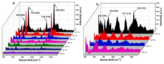Different excitation source wavelengths are applied in Raman spectrometers, which range from ultraviolet (UV) to near-infrared (NIR) and even further. According to the sample absorption characteristics and spectral resolution, different excitation wavelengths should be applied. The light scattering intensity, background fluorescence, and acquisition time are affected by the excitation wavelength. For example, ultraviolet excitation wavelengths range from 100 to 400 nm. They have strong Raman scattering and are suitable for organic biological samples, such as proteins, nucleic acids, and biofilms, due to their resonance with ultraviolet excited light to enhance the Raman signal [37].