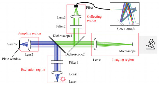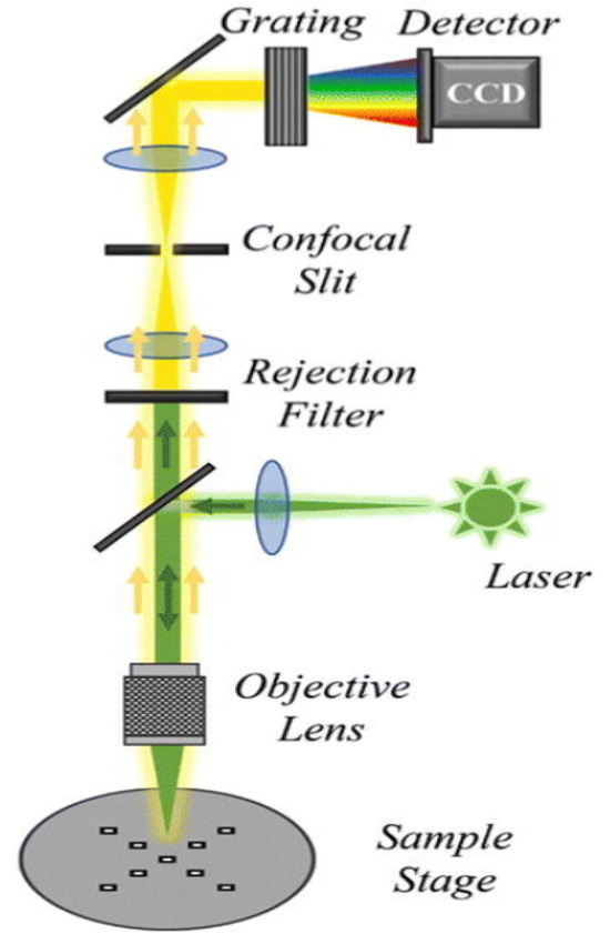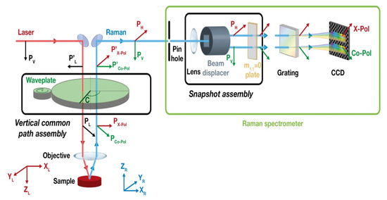 Confocal Micro-Raman Spectroscopy (CM-RS) combines the high-resolution imaging capability of confocal microscopy with the chemical analysis capability of Raman spectroscopy by aligning the laser light source, sample, and detector to effectively filter out stray light from the defocused regions of the sample. Initially, CM-RS had a spatial resolution in the range of 0.5 to 1 µm. With the introduction of methods such as near-field Raman spectroscopy (NRS) and time-resolved Raman spectroscopy (TRS), the spatial resolution of micro-Raman spectrometers has been significantly enhanced, reaching levels as low as several nanometers and even achieving tens of nanometers [30], with the structure of the spectrometer illustrated in Figure 6 [31]. Due to the limited polarization capability of the CM-RS spectrometer, a spectrometer with polarization capability provides symmetry information of molecular vibrations within the Raman spectra, aiding in the identification and characterization of molecular structures.