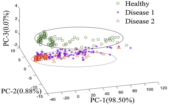 PCA is an unsupervised feature extraction algorithm that projects high-dimensional data matrices onto a lower-dimensional space, selecting independent variables with the greatest variance contribution as the principal components. This algorithm reduces dimensionality while retaining information from the original data [65]. In the detection of apple valsa canker, Zhao et al. [66] utilized the PCA algorithm to perform a linear combination of independent variables from the raw Raman spectral data and ranked them based on their variance contribution rates. The first two principal components achieved a cumulative contribution rate of 99.38%. By analyzing the correlation between the principal components and the original variables (x-loadings), the Raman spectral feature wavenumbers were reduced from 994 to 5, thereby extracting wavenumbers closely related to the disease. This reduction in data dimensionality not only avoided model overfitting but also improved the model’s generalization ability and accuracy. However, when the data contain noise or the dataset is large, PCA’s ability to calculate variance is affected, leading to increased computational costs.