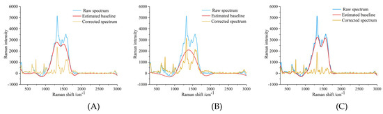 When laser light irradiates a sample, fluorescent materials within the sample absorb photons and emit fluorescence, causing baseline drift in the Raman spectrum. Fluorescent interference obscures the correct spectral distribution, affecting the identification and analysis of Raman peaks. Baseline correction is employed to restore the raw spectrum, with common approaches including polynomial fitting and multivariate scatter correction [51,52].