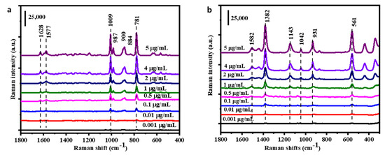 (a) SERS spectra of thiram solution at different concentrations on rigid Ag/Al substrate, (b) SERS spectra of thiram solution at different concentrations on flexible PVA/cellulose/Ag chips.