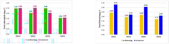 The foliar spray of nutrient formulation significantly increased the total chlorophyll, total phenols and leaf petiole nutrient content in both varieties compared to their respective control. The total chlorophyll content was maximum both at first flowering and first harvest in the Red Lady variety receiving nutrient formulation foliar spray (M2S1), viz., 2.479 mg g−1 and 2.513 mg g−1, respectively, which is on par with TNAU papaya CO 8 receiving nutrient formulation foliar spray (M1S1) and the minimum total chlorophyll content of 1.557 mg g−1 and 1.578 mg g−1, respectively, at first flowering and at first harvest was observed in M2S2 (Red Lady without nutrient formulation spray). For total phenol content, TNAU papaya CO 8 receiving nutrient formulation foliar spray at monthly intervals (M1S1) registered a maximum of 2.431 mg g−1 and 3.321 mg g−1 at first flowering and at first harvest, respectively, and minimum total phenol content was registered in Red Lady receiving no foliar spray of nutrient formulation (M2S2) (Figure 1).