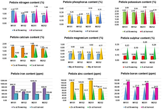 Effect of nutrient formulation foliar spray on leaf petiole nutrient content in commercial varieties of papaya. M1—TNAU Papaya CO 8; M2—Red Lady; S1—Foliar spray of nutrient formulation at monthly intervals; S2—Control (without spray).