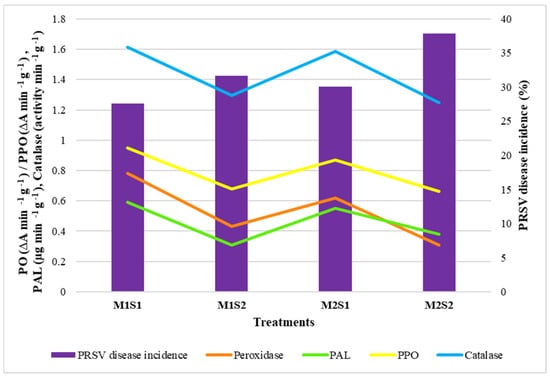 The foliar application of nutrient formulation comparatively enhanced the activities of defense enzymes. The treatment M1S1 (TNAU papaya CO 8 with nutrient formulation foliar spray) recorded the maximum peroxidase activity (0.470 and 0.780 ∆A min−1 g−1), polyphenol oxidase activity (0.810 and 0.950 ∆A min−1 g−1), catalase activity (1.597 and 1.614 activity min−1 g−1), nitrate reductase activity (5.92 and 6.64 µg NO2 g−1 hr−1) and PAL activity (0.530 and 0.590 activity min−1 g−1) at first flowering and first harvest, respectively, followed by M2S1 (Red Lady with nutrient formulation foliar spray) and the minimum enzyme activities were observed in Red Lady without nutrient formulation foliar spray (M2S2) (Figure 3).