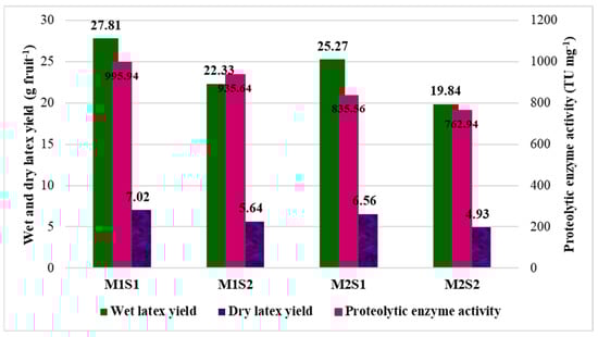 Foliar application of nutrient formulation greatly influenced both varieties’ papain yield and proteolytic enzyme activity. The treatment M1S1 (TNAU papaya CO 8 with nutrient formulation foliar spray) recorded high wet latex (27.81 g fruit−1; 936.02 g tree−1) and dry latex yield (7.02 g fruit−1; 236.36 g tree−1) with high proteolytic enzyme activity (995.94 TU mg−1) followed by M2S1 (Red Lady with nutrient formulation foliar spray), whereas the treatment M2S2 (Red Lady without foliar spray) had minimum papain yield papain activity (Figure 4).
