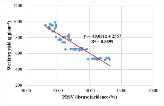 The result indicated a significant positive linear relationship between yield and wet latex yield (R2 = 0.940). However, there was a significant negative linear relationship between yield and PRSV disease incidence (R2 = 0.808) and wet latex yield and PRSV disease incidence (R2 = 0.869) (Figure 5).