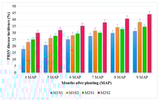 The incidence of Papaya Ring Spot Virus (PRSV) disease was recorded using the 0 to 9 scale score chart (Table 2) provided by Dhanam (2006) [], and the disease incidence was estimated.