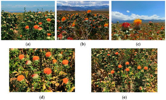 Example of safflower image dataset in complex environment: (a) Sunny, (b) overcast, (c) cloudy, (d) close distance (0.4~0.7 m), (e) far distance (0.7~1 m).