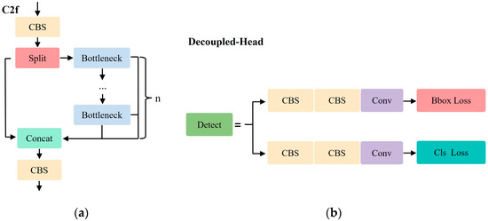 Partial diagram of the model architecture. (a) C2f module structure and (b) Decoupled-Head structure.