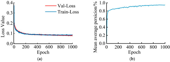 The training was conducted using the default hyperparameters of YOLOv8n. The initial image size was set to 640 × 640 pixels, with a batch size of 16. A learning rate of 0.01 was used, along with a weight decay factor of 0.0005 and a momentum factor of 0.937. The model was trained for a total of 1000 iterations, and the optimal results were analyzed. As shown in Figure 8, the loss function curve and mAP curve during the training process illustrate that as the number of iterations increases, the total loss decreases. As shown in Figure 8a, when the number of training iterations reaches 900, the loss curve begins to plateau and eventually stabilizes at a minimum value of 0.080. Simultaneously, the mAP curve steadily increases with each training iteration and eventually reaches stability. As shown in Figure 8b, the mAP (IoU = 0.5) achieves a value of 95.03%. The trends of the curves throughout the training process effectively reflect the model’s learning progress and the training’s overall effectiveness.