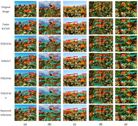 Detection effects of different models on safflower images at different weather and shooting distance: (a) Sunny, (b) overcast, (c) cloudy, (d) far distance, and (e) close distance. The red boxes indicate the filaments in the opening period, the blue boxes indicate the filaments in the shedding period, and the pink boxes indicate the filaments that were missed during detection.
