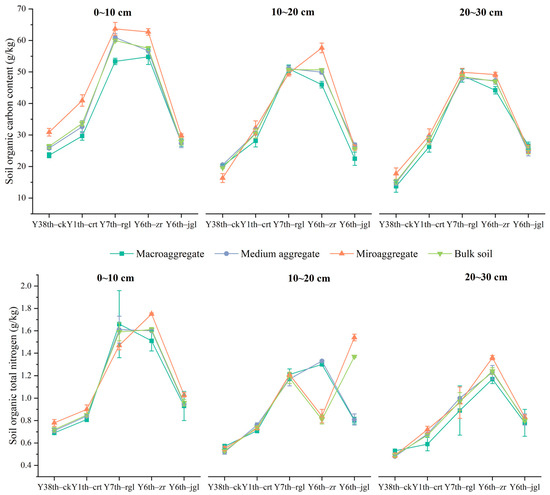4.2. Changes in Organic Carbon and TN in Soil Aggregates Under Different Ecological Construction Measures
