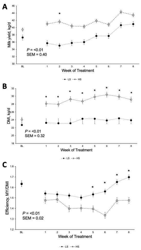 Effects of dietary starch concentration on (A) milk yield (MY), (B) dry matter intake (DMI), and (C) efficiency (MY/DMI). * Indicates a significant interaction (p ≤ 0.05) between week and treatment.