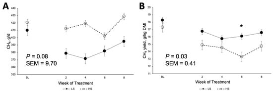 Effects of dietary starch concentration on (A) methane production (g CH4/d) and (B) methane yield (g CH4/kg DMI). * Indicates a significant interaction (p ≤ 0.05) between week and treatment.