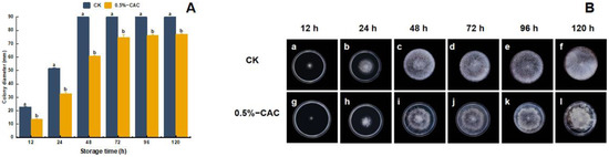 Colony diameter (A) and growth (B) of Rhizopus stolonifer on PDA medium at 12 (a,g), 24 (b,h), 48 (c,i), 72 (d,j), 96 (e,k), and 120 h (f,l). The significant difference between the means in the (A) (p < 0.05) is indicated by letters above the histogram bars.