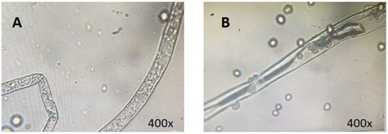 Assessment of mycelial morphology in Rhizopus stolonifer following 5 day incubation. Comparison between CK (A) and 0.5% w/v CAC (B) treatment groups.