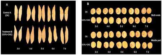 Phenotype is a direct reflection of the genetic traits and environmental conditions of organisms. The assessment of disease management, preservation, and storage efficacy can be effectively conducted through phenotypic observation [26]. The progression of disease in various sweet potato tissues following Rhizopus stolonifer infection was examined. Upon examination of the longitudinal sections, it was observed that the propagation of sweet potato disease spots was minimal, with the primary mode of infection being lateral rather than vertical (Figure 3A). A cross-sectional examination of the inoculated sites in sweet potato tubers disclosed distinct patterns of disease advancement. Specifically, at the 3 day mark post-inoculation, brown discoloration emerged at the extremities of the tubers within the CK, with the central region remaining unaffected. By the 7th day, signs of rot became evident at both ends, and the middle part showed signs of browning. Subsequent to the 0.5% w/v CAC treatment, the expansion of lesions was curtailed across all tuber sections, in contrast to the CK tubers which had escalating lesion progression, tissue discoloration, and eventual internal decay (Figure 3B). In this study, the results underscore the potency of 0.5% w/v CAC in mitigating Rhizopus stolonifer infections and curtailing the incidence of soft rot. It is hypothesized that the variation in disease spot size might be attributed to the delayed activation of some defense mechanisms in sweet potato immediately after the 0.5% CAC treatment.