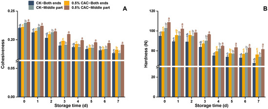 Hardness and cohesiveness are key indicators of texture, signifying a material’s resistance to deformation and its internal binding strength. Zhao et al. [27] found that greater hardness in sweet potato was associated with stronger resistance to soft rot. In this study, similar findings were observed (Figure 4). The CK experienced a rapid decrease in textural attributes after 2 day, whereas the group treated with 0.5% w/v CAC exhibited a slower rate of textural degradation, with significant softening only after 3 day. By the 7th day, sweet potato subjected to the 0.5% w/v CAC treatment retained 3.57% and 4.88% greater cohesiveness in the middle part and both ends, respectively, than those in the CK (Figure 4A). Correspondingly, hardness in the CAC-treated tubers was elevated by 12.58% and 10.42% in the middle and both end sections compared to the CK (Figure 4B). Sweet potato treated with 0.5% w/v CAC exhibited better texture characteristics, speculating that this treatment can improve the soft rot resistance by maintaining the texture characteristics.