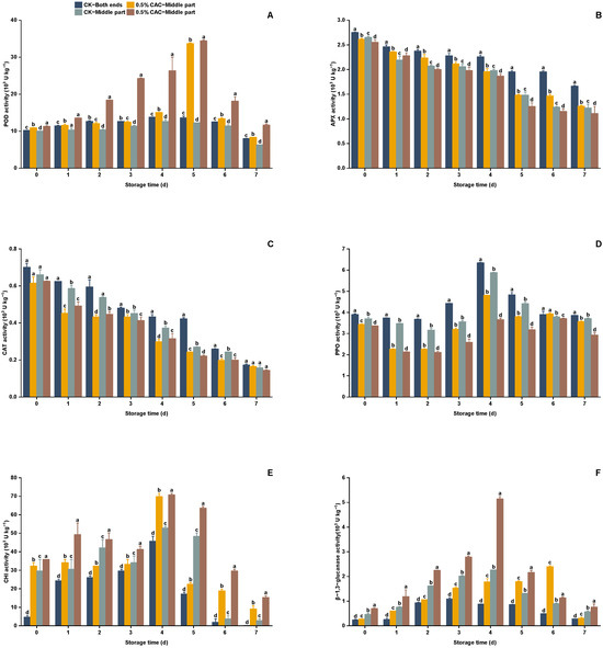 Defense-related enzyme activities were assessed in different treatment groups of sweet potato over 7 day of storage. The enzymes analyzed included POD (A), APX (B), CAT (C), PPO (D), CHI (E), and GLU (F). Significant differences (p < 0.05) between means are indicated by letters above the histogram bars.