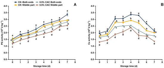 PG activity (A) and Cx activity (B) in different treatment groups of sweet potato over 7 day of storage. Significant differences between the means (p < 0.05) are indicated by the letters above the line chart.