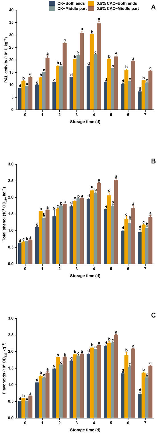 The phenylpropanoid metabolic pathway plays a key role in plant defense mechanisms [47,48]. PAL is the rate-limiting enzyme in the phenylalanine pathway and catalyzes the conversion of L-phenylalanine to antimicrobial compounds, including phenols and flavonoids. This pathway is upregulated in response to plant stress, enhancing disease resistance [49]. Phenolic compounds and flavonoids are recognized for their antioxidant and antimicrobial properties [50,51]. These compounds accumulate in plant tissues upon pathogen invasion, forming a protective barrier [52]. In this study, it was found that all parts of the tuber activated the phenylpropanoid metabolic pathway following 0.5% CAC w/v treatment. The activity of PAL exhibited a biphasic pattern, initially increasing to reach a peak on the fourth day. In all treatment groups, the PAL activity was lower at both ends of the sweet potato than in the middle section. The treatment with 0.5% w/v CAC significantly increased PAL activity compared to the CK (Figure 7A). In particular, on the fourth day, the PAL activity in the end and middle sections of the CAC-treated sweet potato was increased by 72.49% and 56.09%, respectively, compared with the CK. The 0.5% w/v CAC treatment significantly increased the total phenol content in comparison to the CK (Figure 7B). In particular, on the fourth day, the total phenol content in both ends and the middle sections of the CA-treated sweet potato was increased by 13.21% and 13.08%, respectively. Similarly, the 0.5% w/v CAC treatment also significantly augmented the flavonoid content when compared to the CK (Figure 7C). On the fifth day, the flavonoid content in both ends and the middle sections of the CAC-treated sweet potato was increased by 4.43% and 10.56%, respectively, relative to the CK. These findings align with Liu et al. [9], who reported similar results regarding the activation of the phenylpropanoid pathway. It is hypothesized that the modulation of the metabolic pathway of phenylpropane through CAC treatment could be a strategic approach to enhance the durability of sweet potato against postharvest diseases.