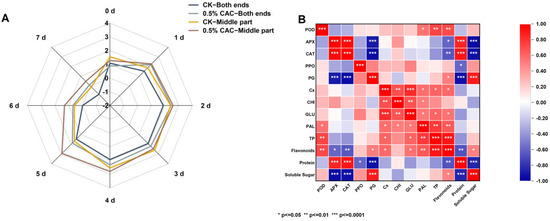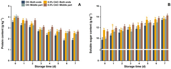 Changes in protein (A) and soluble sugar (B) content in different sweet potato tuber sections over 7 day of storage under CK and 0.5% w/v CAC treatment conditions. Significant differences (p < 0.05) between means are indicated by letters above the histogram bars.