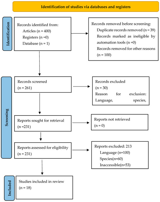 Records identified in the process of writing this review consisted of 400 articles and 1 database. For the quantitative assessment, preference was given to studies that were either a randomized experiment or used a quasi-experimental method. The qualitative assessment was conducted to select studies that met two criteria: (1) studies with clear research objectives that were relevant to the current review; and (2) studies that provided sufficient information related to the context, sample selection, and data collection procedures. Records such as duplicates (39) and studies addressing origins, phenotypic and genetic diversity, the conservation of indigenous chickens, semen cryopreservation of indigenous chickens, climate change effects on indigenous chickens, and the use of extenders with exotic chickens and other chicken types, reports that were in other languages, and reports that were inaccessible were excluded (213). Peer-reviewed articles published between 2000 and 2024 were selected and used in this review. Articles addressing origins, phenotypic and genetic diversity, the conservation of indigenous chickens, semen cryopreservation of indigenous chickens, climate change effects on indigenous chickens, and the use of extenders with indigenous chickens were included in this review. Moreover, 18 articles were considered for this review and were strictly selected based on the country they were from (South Africa).