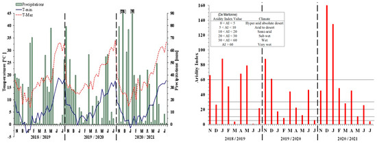 Decadal minimum [—] and maximum [- - -] temperatures (°C), rainfall [█] (mm) at the experimental site, and aridity index (red horizontal columns) throughout the periods of study from 2018 to 2021.