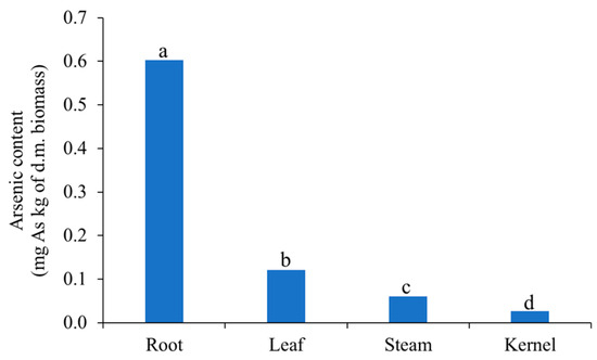 Arsenic content in each part of the plant. Values with different letters are statistically different according to LSD (0.05). Values of bars with different letters are statistically different according to LSD (0.05).