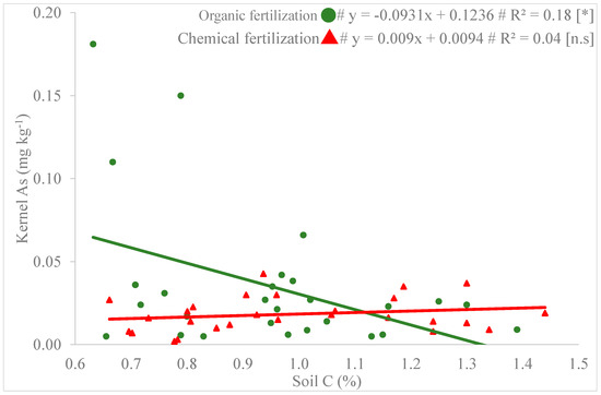 Soil carbon content plotted against arsenic content in the kernel as affected by fertilization. In the square brackets, * and n.s. represent significance for p < 0.05 and no significance, respectively, according to an ANOVA test.