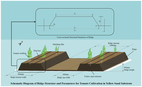 Structural configuration and parameters of the ridge profile for tomato cultivation in yellow sand substrate.