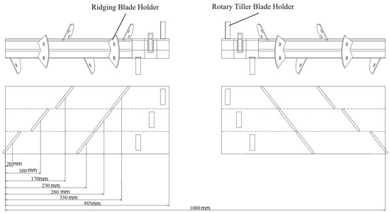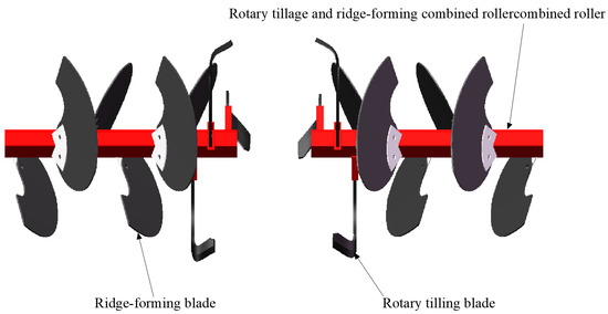 The ridging blades are arranged in a variable-pitch helical configuration, with the mounting angle γ of each blade holder maintained between 25° and 26°. Within the same rotational plane, the rotary–ridging composite blade drum adopts a symmetrical arrangement on both the left and right sides to ensure that the blades on either side enter the soil simultaneously. This configuration balances the lateral forces of the ridge-forming and film-mulching machine, enabling it to travel in a straight path without deviation.