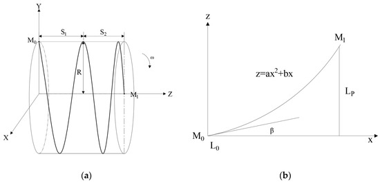 Based on this kinematic principle, the Z-axis is taken as the axis of the ridging blade, and a Cartesian coordinate system is established as illustrated in Figure 4b. Let R be the helix radius, M0 the starting point of the spiral, and β the initial helix angle. When point M moves along the helix, the axial displacement is denoted Lp. The parametric equation of the helical curve in terms of R, β, k, Lp, can be expressed as