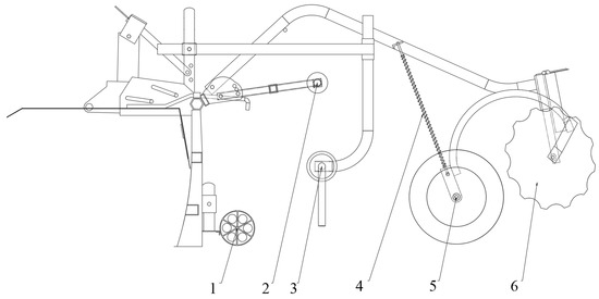 Structural schematic of the mulching device. 1 walking wheel; 2 mulch rack; 3 pressing roller; 4 spring; 5 pressing wheel; 6 soil-covering disc.
