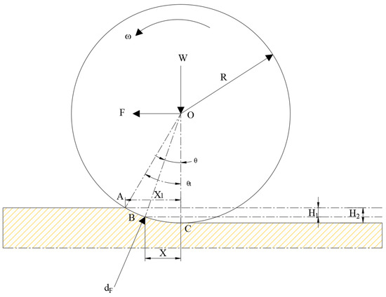 When the pressing unit is in operation, the force analysis of the pressing roller is shown in Figure 9. The most significant factors affecting mulching quality are the load W (external load and self-weight) applied by the pressing roller to the soil–film interface and the penetration depth H1 [32]. These parameters must be effectively controlled to ensure consistent quality. When the pressing roller rotates under the driving force F, the soil and the mulch exert a compressive reaction force dF on the small contact arc segment s at point B of the ABC contact region. This can be expressed as