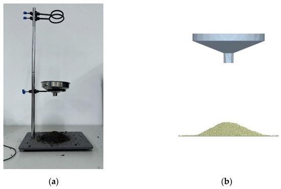 Although these studies have provided valuable references for the mechanization of yellow sand substrates, research specifically targeting yellow sand substrates remains in its infancy. Under low moisture conditions, yellow sand exhibits almost no intrinsic cohesion; however, in an unsaturated state, the matric suction and liquid bridge effects impart weak apparent cohesion and tensile strength to the system, thereby enhancing the self-supporting capacity of the pile structure in the short term [23]. Therefore, in this study, a slight degree of bonding was introduced in the DEM model to represent this weak cohesion. The tillage depth and target ridge height were then optimized within the stability zone that maintains weak cohesion. Simultaneously, the contact and friction parameters of the sandy soil were inversely calibrated using measurable macroscopic indicators [24]. Following the method proposed by Zhang Rui et al. [25] for DEM parameter calibration of sandy soils, the model was first calibrated to match the simulated repose angle with the measured value, and the bonding strength was then fine-tuned within the weakly cohesive framework to ensure the stability of both the ridge and pile structures.