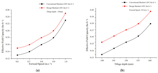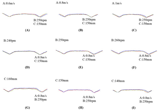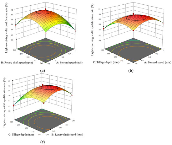 Figure 22a shows that, when tillage depth and rotary shaft speed are constant, light-receiving surface width qualification rate initially increases and then decreases with increasing forward speed, with the optimal range being 0.648–0.884 m·s−1. Figure 22b shows that, when tillage depth and forward speed are fixed, light-receiving surface width qualification rate first rises and then falls with increasing rotary shaft speed, with the optimal range being 253–265 rpm. Figure 22c shows that, when rotary shaft speed and forward speed are constant, light-receiving surface width qualification rate decreases with increasing tillage depth, with the optimal range being 142–152 mm.
