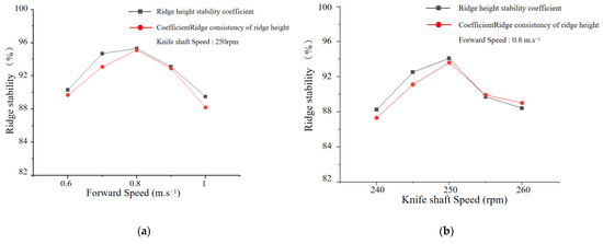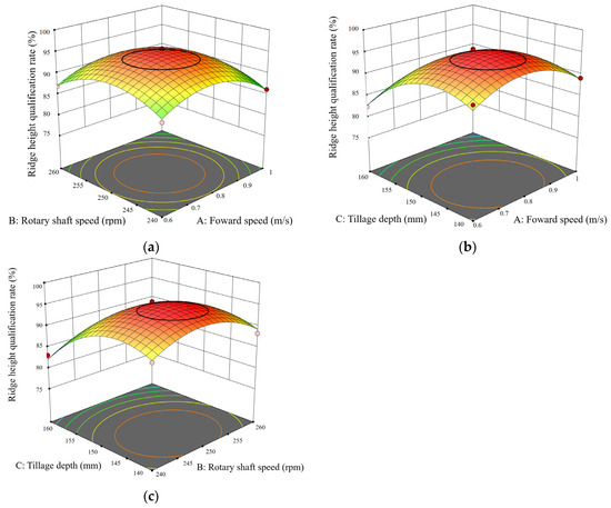 Figure 21a shows that, when tillage depth and rotary shaft speed are held constant, the ridge height qualification rate initially increases and then decreases with increasing forward speed, with the optimal range being 0.71–0.82 m·s−1. Figure 21b shows that, when tillage depth and forward speed are fixed, ridge height qualification rate first rises and then falls with increasing rotary shaft speed, with the optimal range being 254–260 rpm. Figure 21c shows that, when rotary shaft speed and forward speed are constant, ridge height qualification rate decreases with increasing tillage depth, with the optimal range being 141–150 mm.