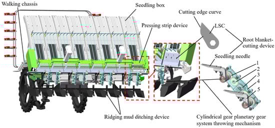 As shown in Figure 1, the rice blanket seedling-cutting and -throwing transplanter primarily consists of six components: the walking chassis, seedling box, root blanket-cutting device, pressing strip device, cylindrical gear planetary gear system throwing mechanism, and ridging mud ditching device. The machine operates with eight working rows, using 7-inch ordinary blanket seedlings, and the root blanket’s length, width, and height dimensions are 589 × 228 × 25 mm, respectively. The primary working process of the rice blanket seedling-cutting and -throwing transplanter is as follows: root blanket longitudinal cutting, point pressure on root blanket strips (RBSs), RBS lateral cutting, seedling needle transporting and throwing planting SB, and ridging mud ditching and standing seedlings. All parts work together to complete some processes simultaneously, which can effectively improve the quality and efficiency of rice blanket seedling-cutting and -throwing transplanter operation.