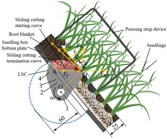 The force analysis of the longitudinal cutting process of the root blanket is carried out, and the force on the root blanket is shown in Figure 2. As both the root blanket and the cutting device are fixed to the transplanter and remain relatively stationary, there is no relative motion between them resulting from the transplanter’s forward speed. Consequently, the forward speed of the transplanter is not considered in the force analysis of the root blanket. Similarly, Zhang et al. did not consider the influence of the forward movement of the machine in the force analysis when studying the seedling separation stage []. Point O is defined as the center of the LSC’s rotation, and the contact point M between the edge curve and the rice blanket when the LSC begins to enter the cutting zone is used as the detachment point for analysis. A tangent line A-A′ is drawn along the edge curve at point M. The velocity at point M, denoted as V, is perpendicular to the radius OM. The angle between the V direction and the n-n′ direction normal to the M point is the sliding angle . FR is the combined force of the normal force FN and friction force Ff of the edge on the point M. The angle between FR and FN is the friction angle φ of the edge to the root blanket. FN is decomposed into FN1 and FN2 along the A-A ‘and V directions, respectively. It is observed that FN2 contributes only to the translational movement of the rice blanket along the direction of V and has a negligible effect on the sliding cutting action of LSC. From the geometry in Figure 2, it follows that